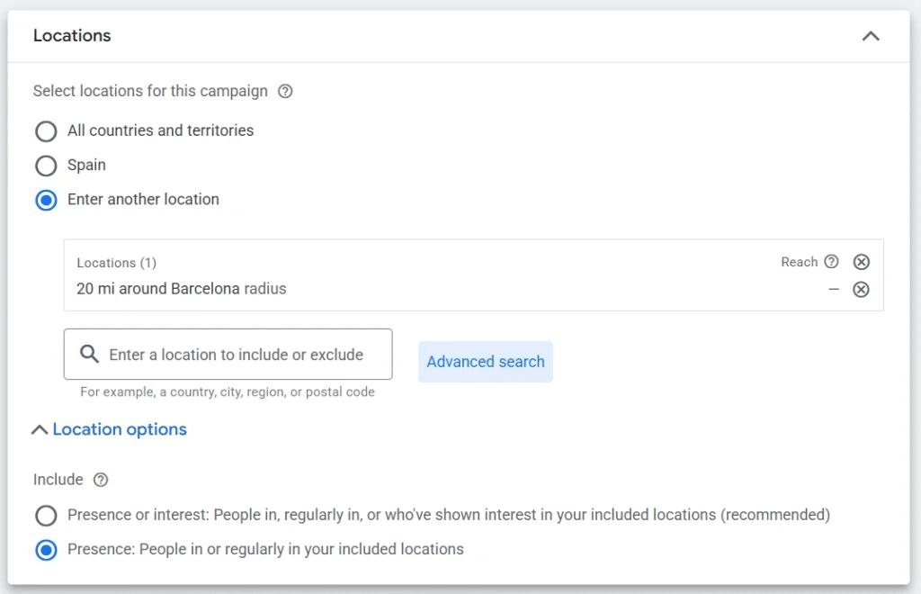 Opciones de ubicación: Configura esto en «Presencia» (personas que están o se encuentran habitualmente en tus ubicaciones objetivo), no en «Interés». El ajuste «Interés» puede mostrar tus anuncios a personas de cualquier parte del mundo que hayan mostrado interés en tu ubicación, lo que puede desperdiciar el presupuesto de la subvención.