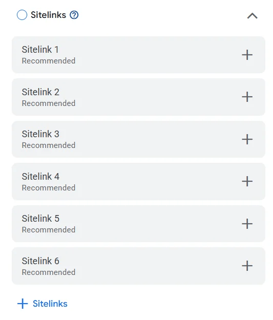 También puedes incluir enlaces de sitio (sitelinks) aquí (que solo se aplicarán a esta campaña Pmax), pero puede que no sea necesario si ya tienes más de 4 enlaces de sitio a nivel de cuenta que también sean relevantes para esta campaña. No dupliques los mismos enlaces de sitio a nivel de campaña y de cuenta. No crees demasiados enlaces de sitio (lo ideal suele ser entre 6 y 8 por campaña).