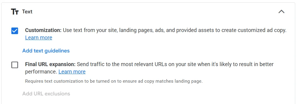 Puedes usar la «Optimización de texto» sin la expansión de URL final. Esto tiene sentido si crees que la IA podría crear mejores títulos y descripciones que los que tú has configurado manualmente. A veces la IA encuentra grandes ideas, y a veces crea textos horribles o irrelevantes, así que es una pequeña apuesta. Pero normalmente no tiene un gran impacto y desde luego no es tan importante como el ajuste de «Expansión de URL final».