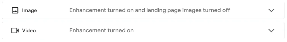 Las opciones de mejora de imagen y vídeo no son importantes. Puedes dejarlas activadas si quieres (el vídeo no se aplicará en absoluto para Ad Grants y la imagen podría ayudar un poco con el rendimiento del anuncio, pero normalmente no mucho).