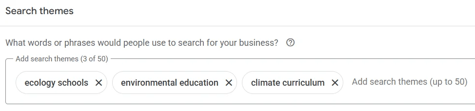 Los temas de búsqueda son temas generales relevantes para tu campaña. NO son palabras clave, pero están relacionados, y proporcionan orientación temática a la IA. Por ejemplo, si tienes en marcha una campaña de recursos de educación ambiental, tus temas de búsqueda podrían incluir: «escuelas de ecología», «educación ambiental» o «plan de estudios sobre el clima».