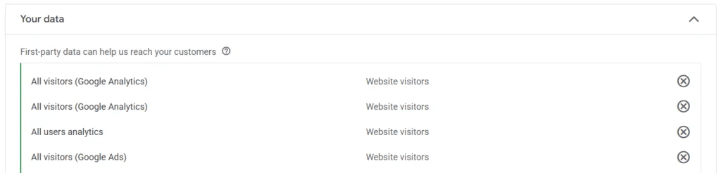 PMax analizará a estos visitantes y encontrará nuevos usuarios que compartan características similares. Esta es una de las señales más potentes disponibles. Puedes dirigirte a todos los visitantes de tu web o a segmentos concretos (ej. usuarios que han completado una compra o donación, visitado una página o sección concreta de tu web, etc.).