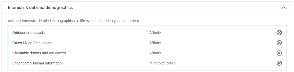 Audiencias con intención de compra (In-Market): Son personas que Google ha identificado que buscan activamente realizar una acción concreta. Por ejemplo, personas interesadas en «oportunidades de voluntariado» o «donaciones benéficas».