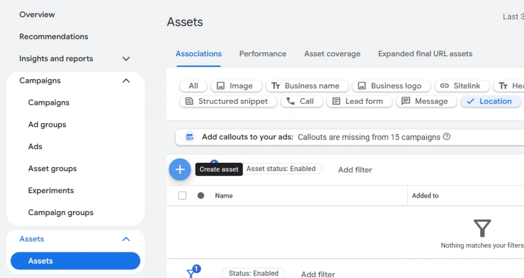 En tu cuenta de Google Ads, ve al menú «Recursos», selecciona el tipo de recurso «Ubicación» y vincula tu Perfil de Empresa en Google con tu cuenta de Google Ads. Normalmente, los recursos de ubicación se añaden a nivel de cuenta. Solo debes configurarlos a nivel de campaña si tu organización tiene varias ubicaciones y necesitas mostrar direcciones distintas para campañas diferentes.