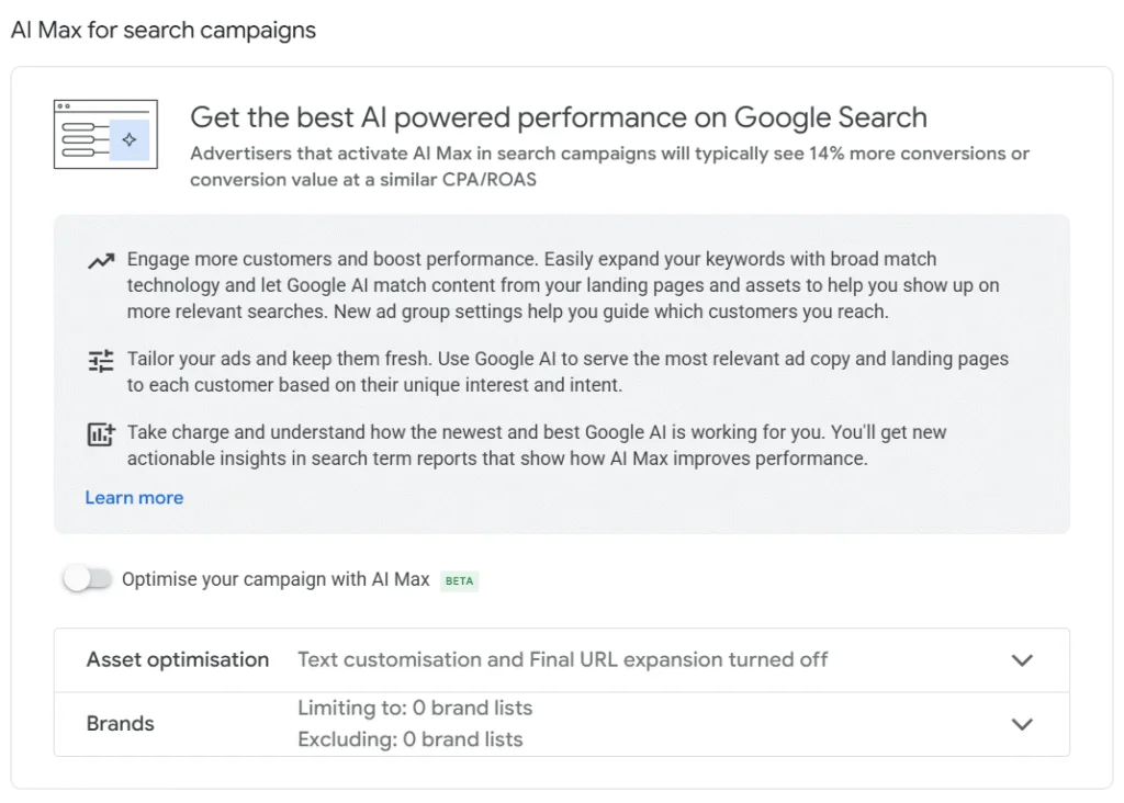 AI Max puede ser interesante si no estás gastando todo el presupuesto de tu subvención y quieres usar la IA para explorar otras palabras clave y páginas que podrían generar conversiones extra.