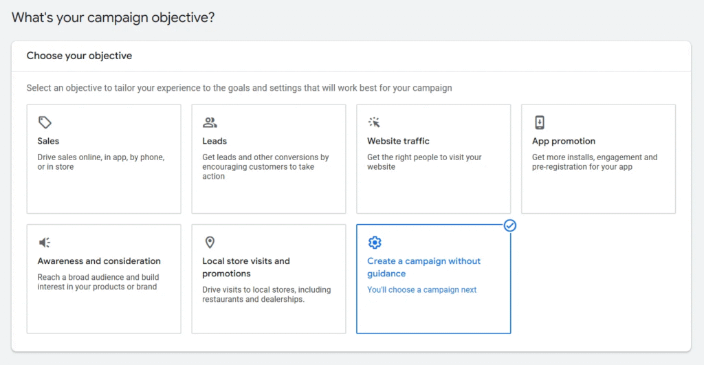 Al crear una nueva campaña PMax, te pedirán que elijas un objetivo. Para las cuentas de Google Ad Grants, el enfoque recomendado es seleccionar «Crear una campaña sin objetivo». Esto evita que Google influya demasiado en tus ajustes con recomendaciones automáticas que puede que no encajen con los objetivos de tu ONG.